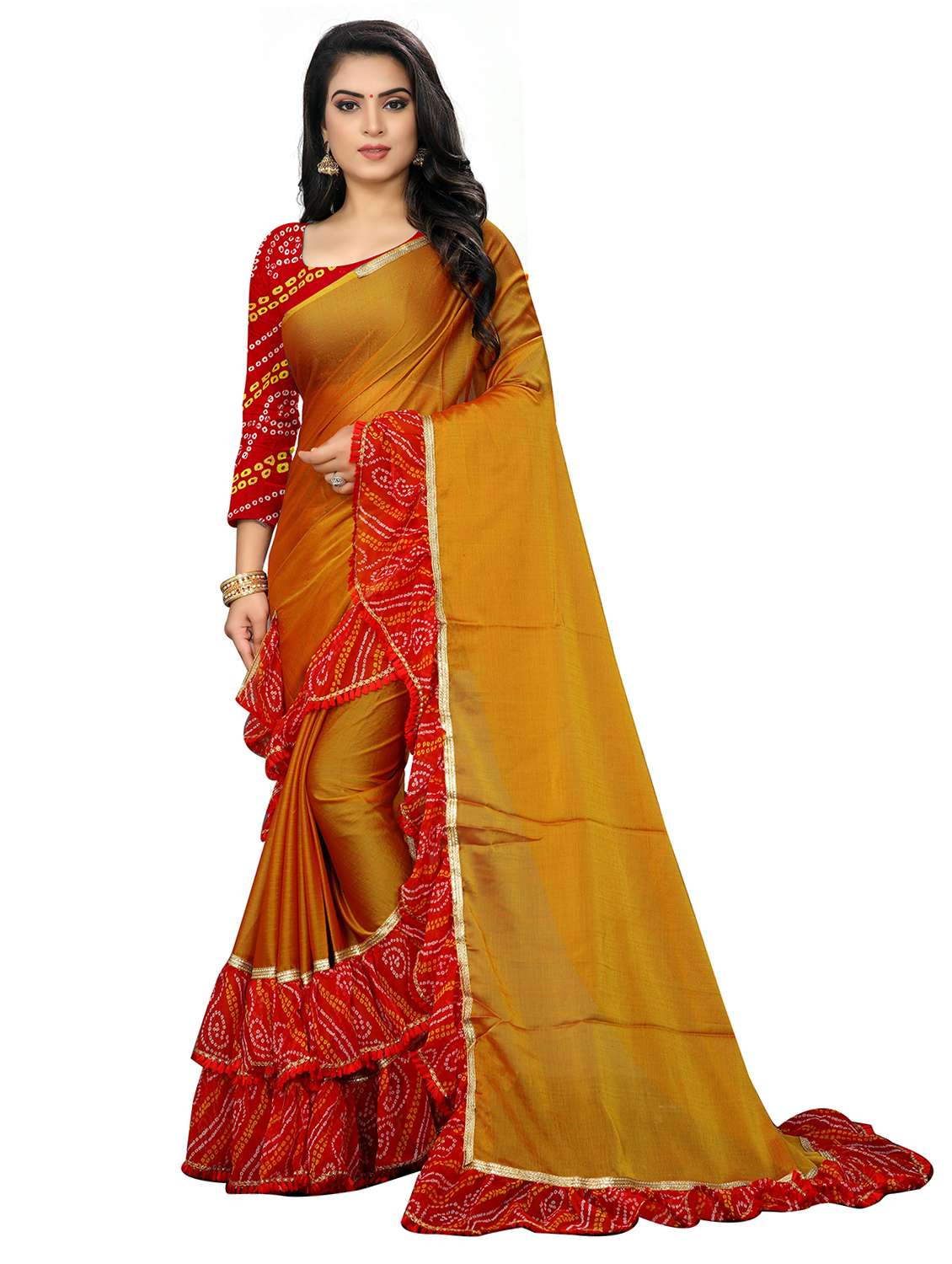 Saree Fabric : Chiffon , Blouse Fabric : Banglori Silk ,Work : Embroidery With Bandhani Ruffle Design Party Wear Saree . Saree length : 5.5 Mtr Blouse length : 0.8 Mtr Unstitched Blouse Pack of 1 Saree : 1Blouse