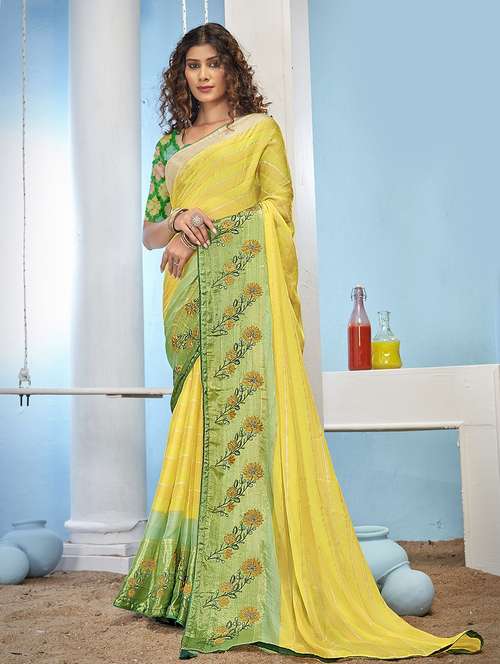 yellow colored embroidered saree with blouse