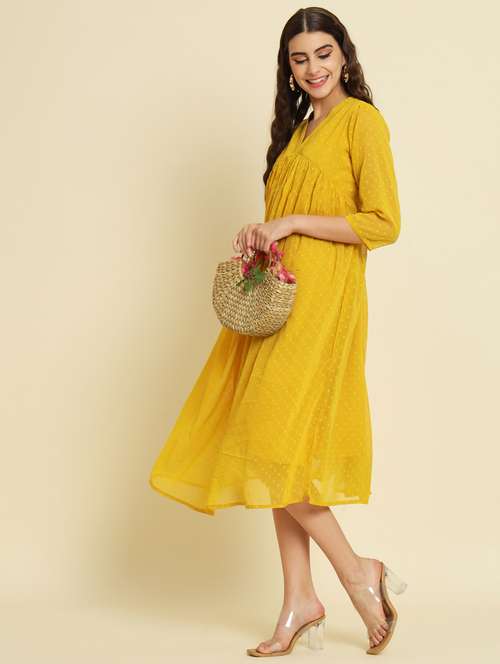 women yellow self design detailed dress
