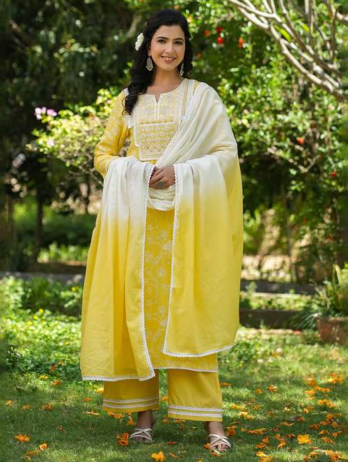 - Find gorgeous sets of ethnic wears in trending designs in yellow colors suitable for festive wear of occasions.
