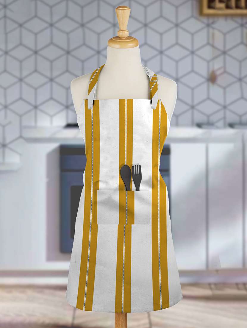 - Working in kitchen can spoil your clothes many a times. Therefore, an apron is a must. Get aprons from BBM in yellow colours.