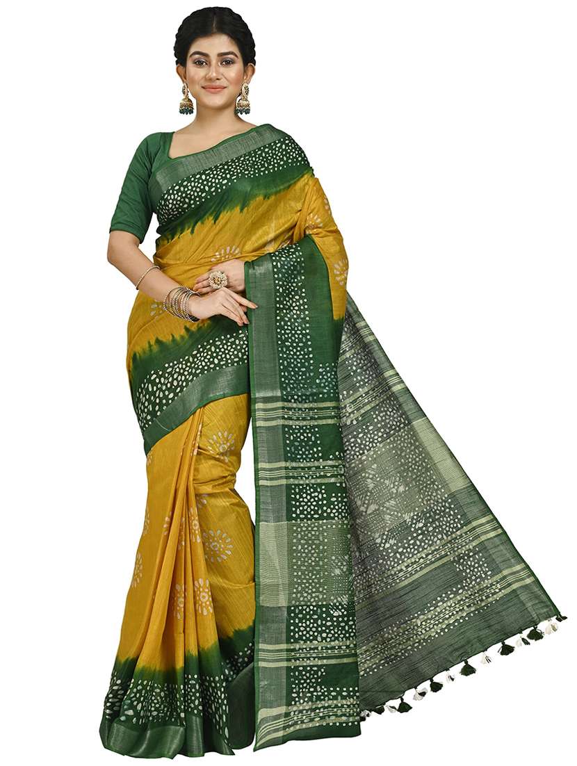 - » women mustard & green batik printed saree with blouse