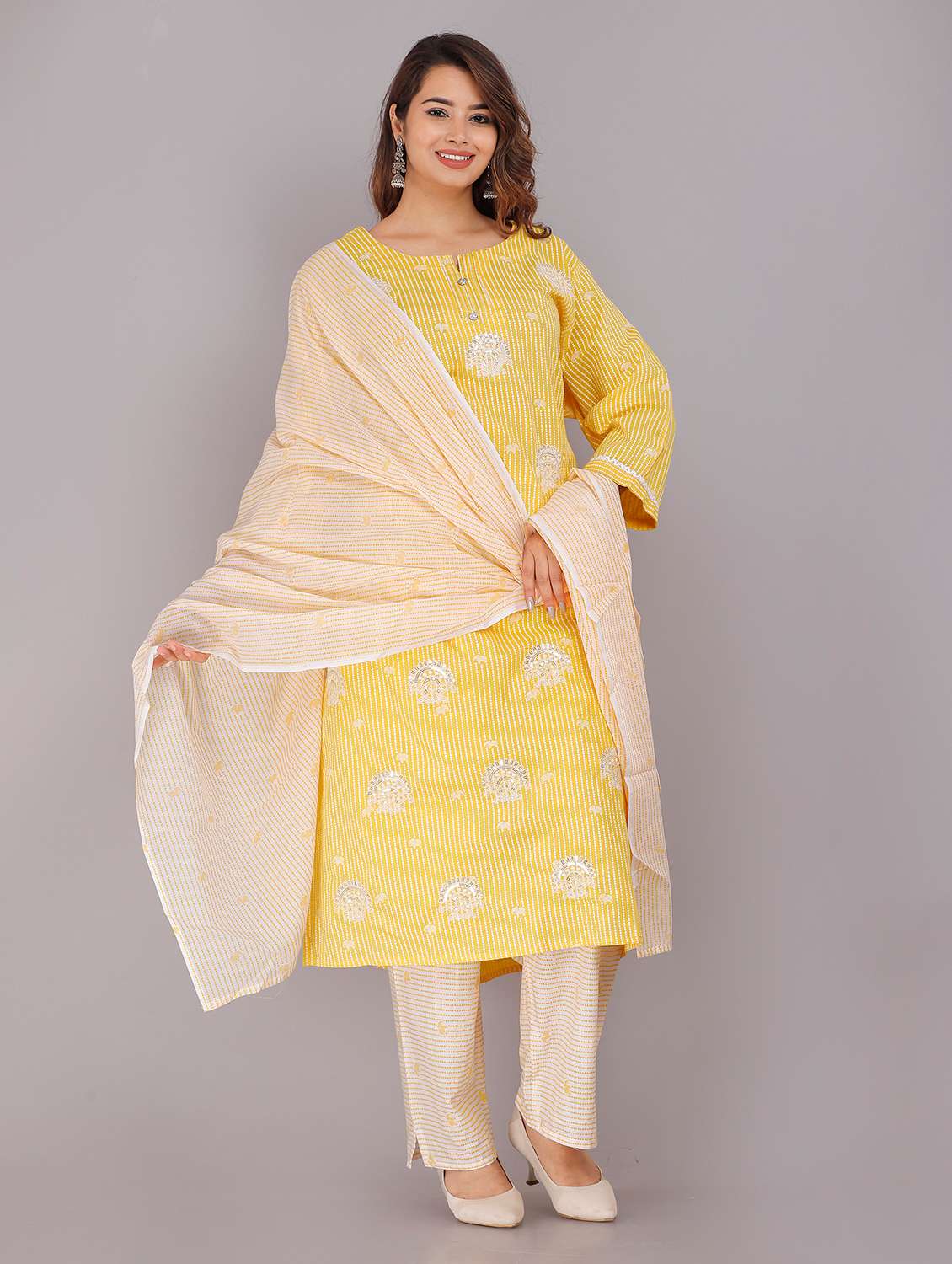 yellow coloured embroidered kurta pant set