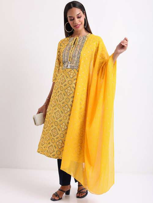 • Find gorgeous sets of ethnic wears in trending designs in yellow colors suitable for casual wear of occasions.
