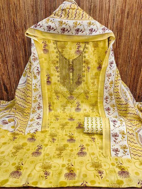 • Look ultra gorgeous in unstitched suits from Leeli Peeri Designer and grab these beautiful suits in yellow colour.