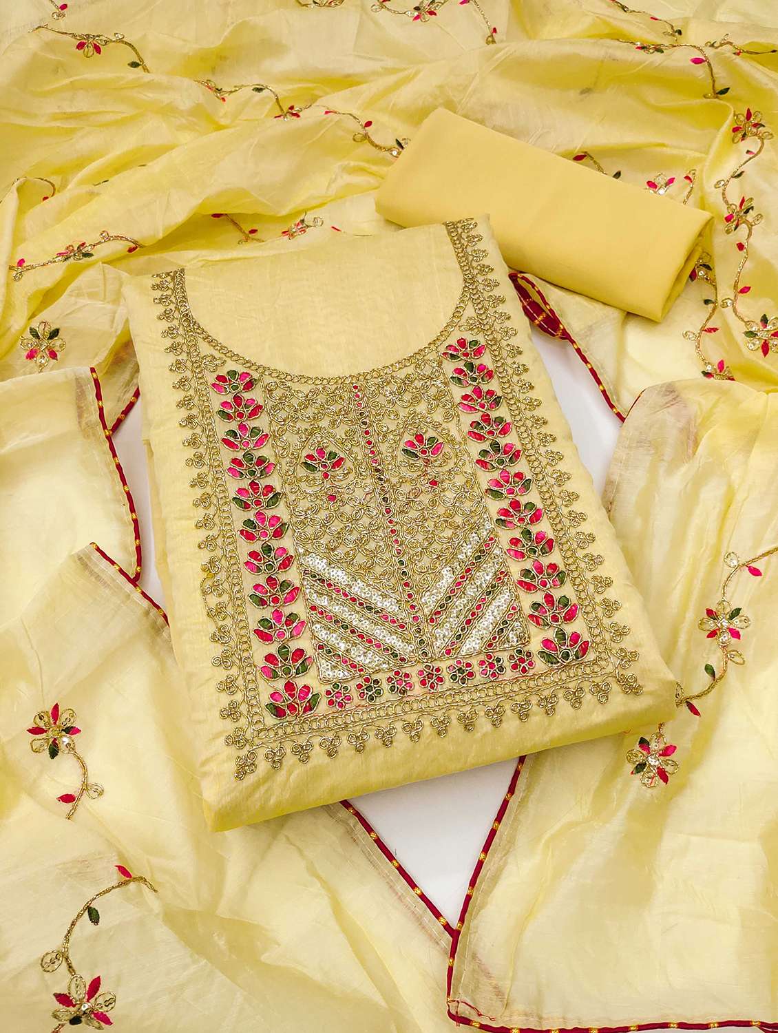 - Look ultra gorgeous in unstitched suits from Leeli Peeri Designer and grab these beautiful suits in yellow colour.