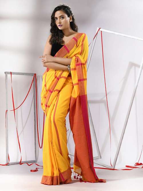 Look royal and loving in this yellow cotton soft saree. It has woven designs and patterns for a beautiful look.