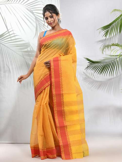 Get a poised and dainty look in this bright yellow pure cotton taant saree. It has woven designs and patterns all over for a beautiful look.