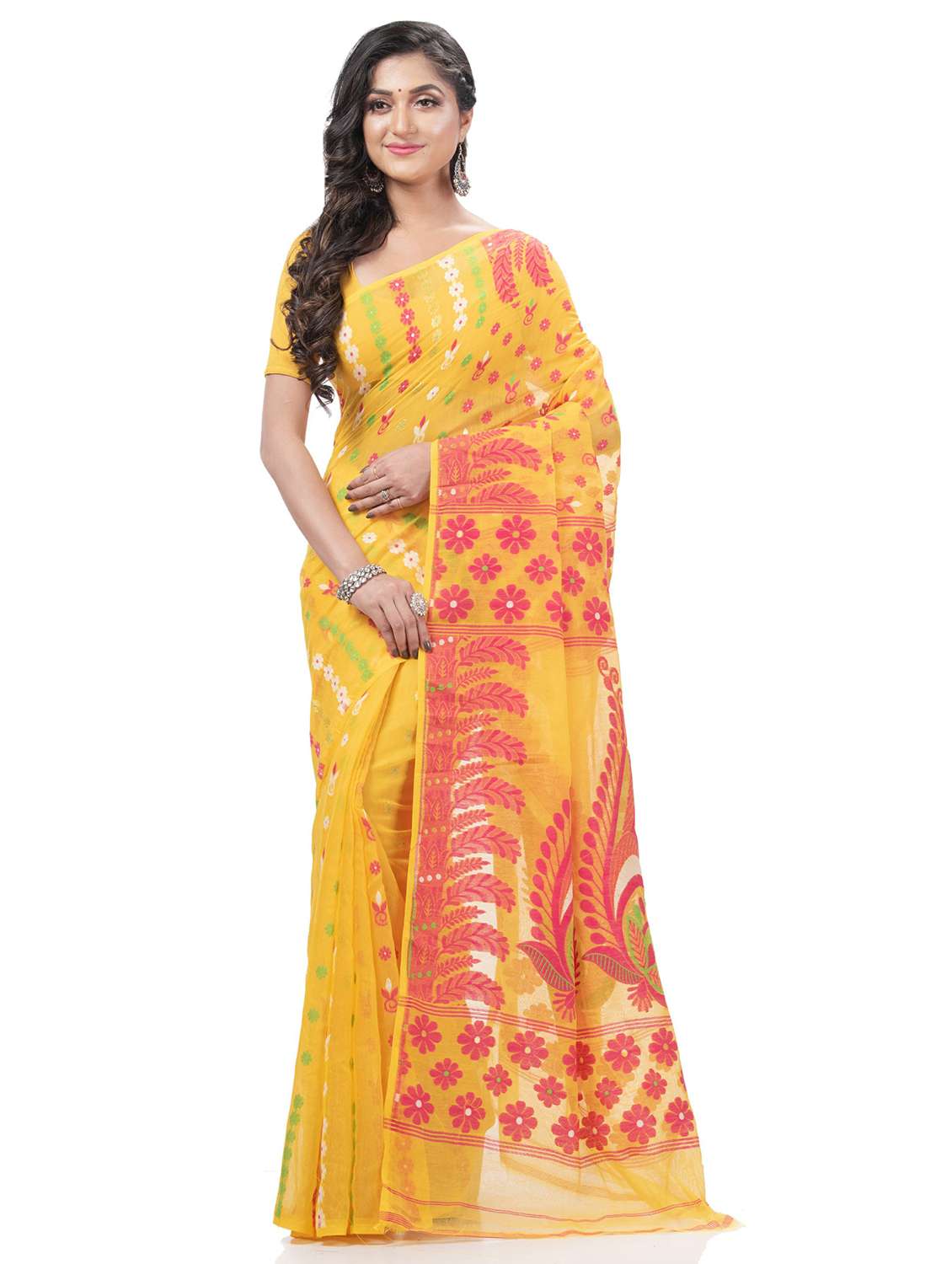 Explore the collection of beautifully Bengal Traditional Tant/Tangail Handloom Hand Made Digital MinaKarat Resham Dhakai jamdani Bengal Pure Cotton Handloom Saree Whole Body Design from Desh Bidesh . Each piece is elegantly crafted and will surely add to your wardrobe. Pair this piece with heels or flats for a graceful look. You can wear this saree in all occasions specially Puja, Party and any occasion in your family or friends. The decorative material is Cotton Threads. Its Uniquie cotton thread design whole body. great looking color combination The Elegant Class saree has comes from the Desh Bidesh. customer satisfaction is the utmost priority . The color may vary due to screen setting . Fabric: Cotton; Length: 5.50 meter Set Content: Without Blouse Piece Care Instructions: Dry Clean Only Wash Care : Dry Wash Only, Don’t Bleach