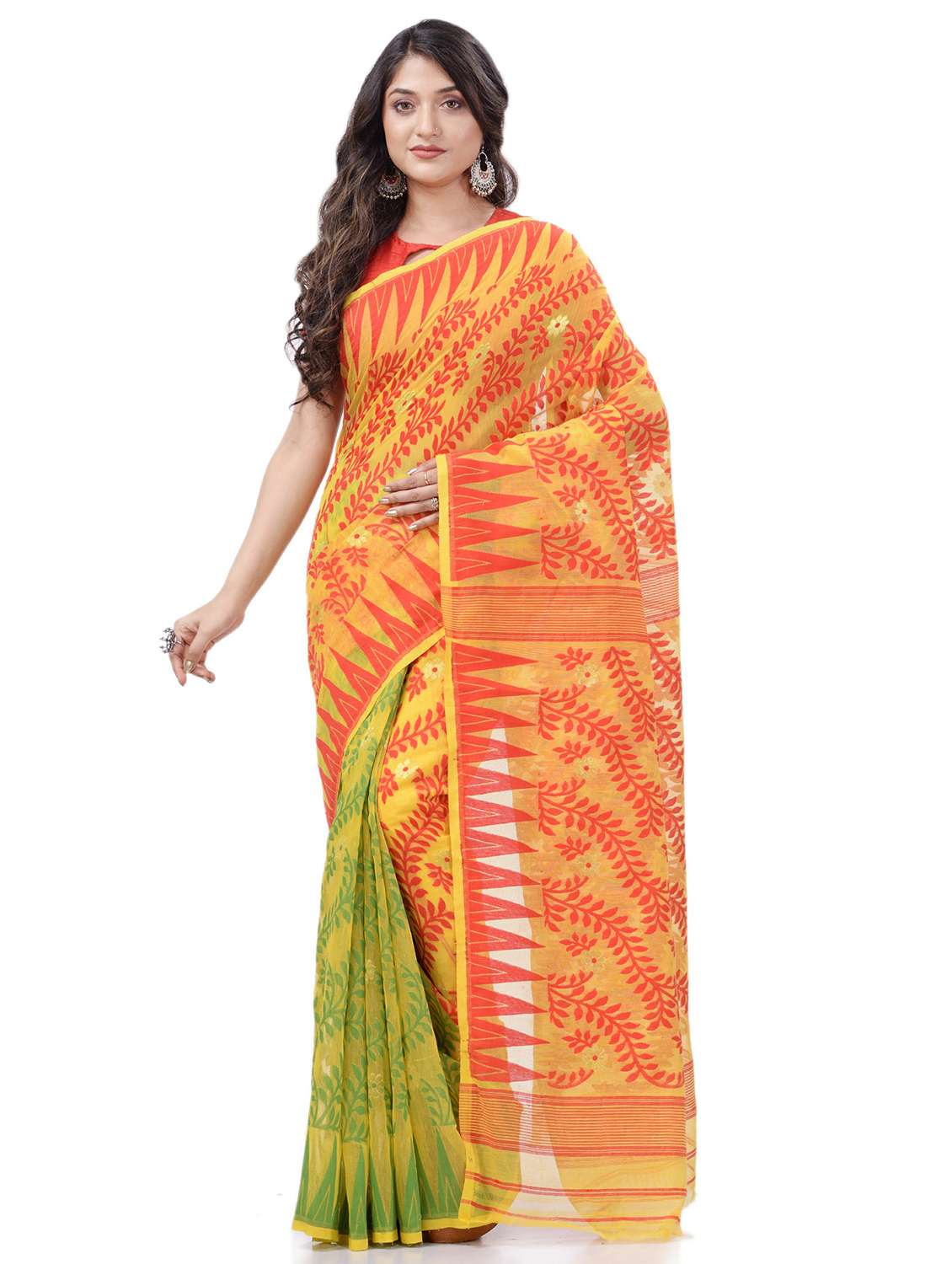 Explore the collection of beautifully Bengal Traditional Tant/Tangail Handloom Hand Made Digital MinaKarat Resham Dhakai jamdani Bengal Pure Cotton Handloom Saree Whole Body Design from Desh Bidesh . Each piece is elegantly crafted and will surely add to your wardrobe. Pair this piece with heels or flats for a graceful look. You can wear this saree in all occasions specially Puja, Party and any occasion in your family or friends. The decorative material is Cotton Threads. Its Uniquie cotton thread design whole body. great looking color combination The Elegant Class saree has comes from the Desh Bidesh. customer satisfaction is the utmost priority . The color may vary due to screen setting . Fabric: Cotton; Length: 5.50 meter Set Content: Without Blouse Piece Care Instructions: Dry Clean Only Wash Care : Dry Wash Only, Don’t Bleach