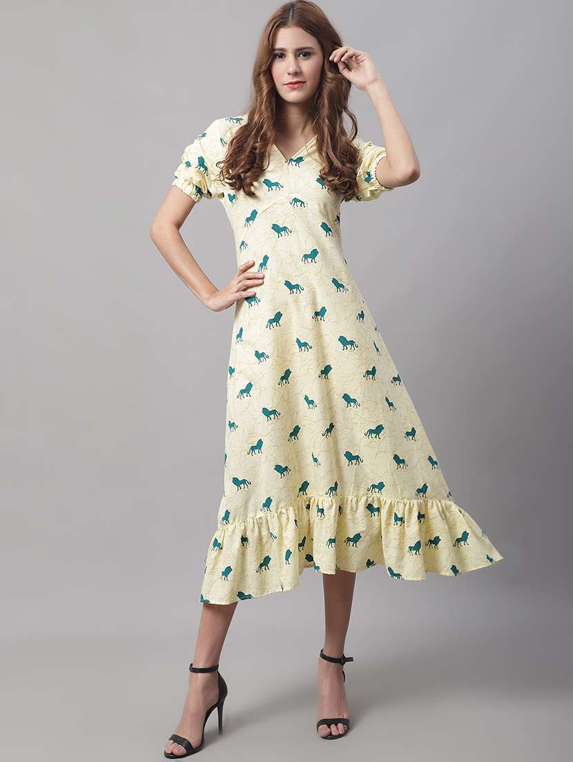 - Dress up in a soothing pattern and don this dress made of cotton material.
