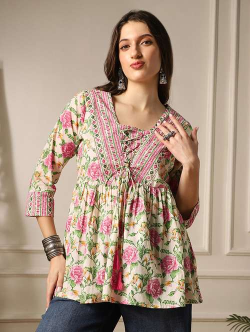 - » globus women yellow v-neck floral print tie-up tassel detail gathered top