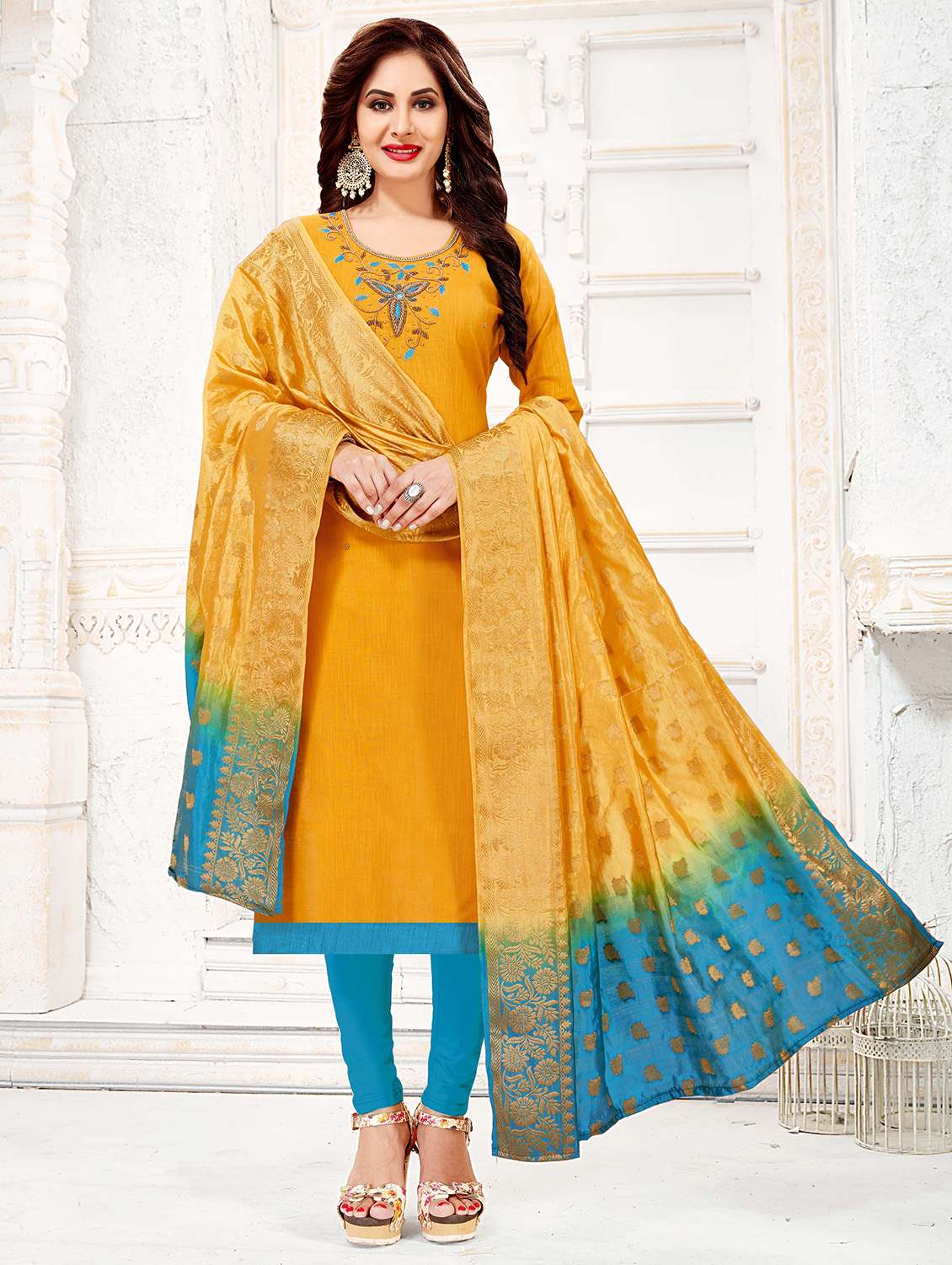 - Look ultra gorgeous in unstitched suits from Kimisha and grab these beautiful suits in yellow colour.