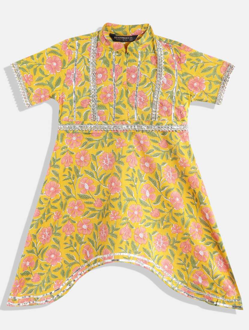 A line Cotton Fabric Yellow Color Floral Print Dress with gotta work at Neck & Bottom