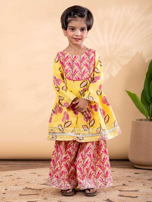 girls floral print long sleeve kurta and sharara set