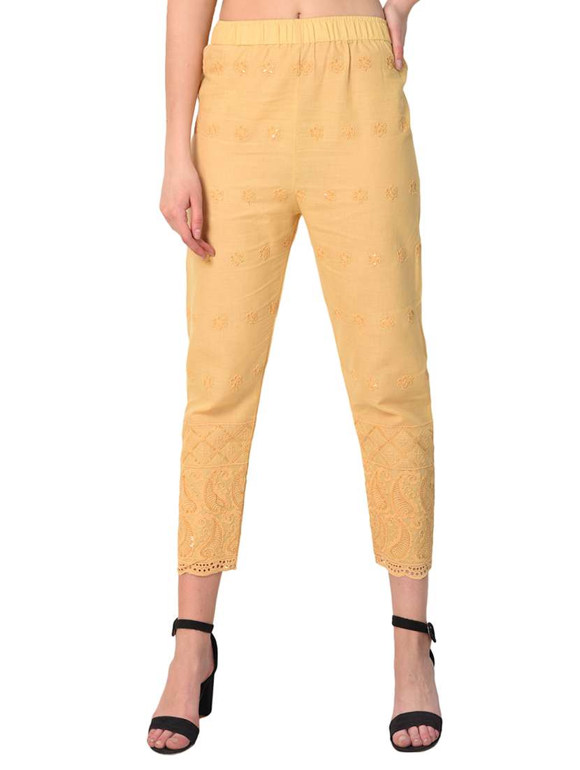 Created in a slim fit silhouette, these palazzo by Brand SANGANI are a real visual delight. Showcasing a embroidered design with transaparent sequin randomly placed, these palazzo look visually appealing. Tailored to perfection from cotton for a comfort, these palazzo will go well with a voguish top and peep toes.