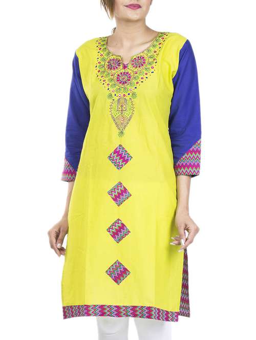 yellow cotton embroidered kurta - 11444505 - Very Small Image - 1