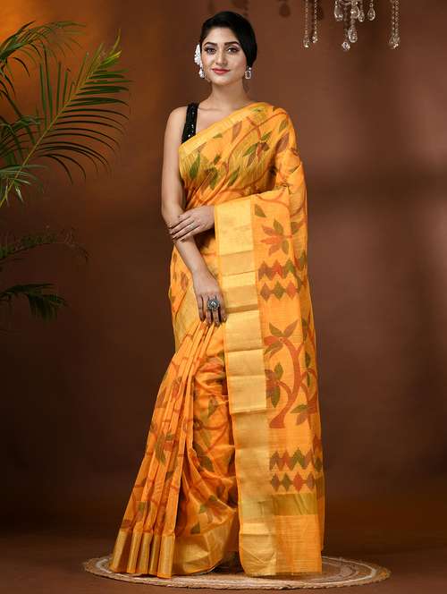 Explore the collection of beautifully Bengal Traditional Tant/Tangail Cotton Silk Handloom cotton Blend Saree of West Bengal Floral Leaf designed sarees from Desh Bidesh. Each piece is elegantly crafted and will surely add to your wardrobe. Pair this piece with heels or flats for a graceful look., customer satisfaction is the utmost priority of this company. Material: Handmade Tant Silk Handloom Cotton saree; Saree Length: 6.3 m or Free Size With Blouse Pcs.; The color may vary due to screen setting . This Cotton sarees are evergreen sarees which never go out of style, especially in those parts of India where the heat becomes unbearable in the summer months. This saree will give you a very ethnic and attractive look. This saree is made with Tant Silk Squence Handloom Cotton saree. Saree border is made by cotton silk thread. We had given light starch in this cotton tant saree so that you can fold patli perfectly. The saree comes with a broad Borders. Which is well suited for a perfect traditional look. The saree comes with a blouse piece which is similar to the shade of the saree. It is unstitched and can be altered according to your fit and style that you require. Wash care: 1st Dry Wash then hand Wash only cold water Fabric: Cotton Silk; Length: 6.3 meter Set Content: With Blouse Piece Care Instructions: Dry Clean Only Wash Care : Dry Wash Only, Don’t Bleach