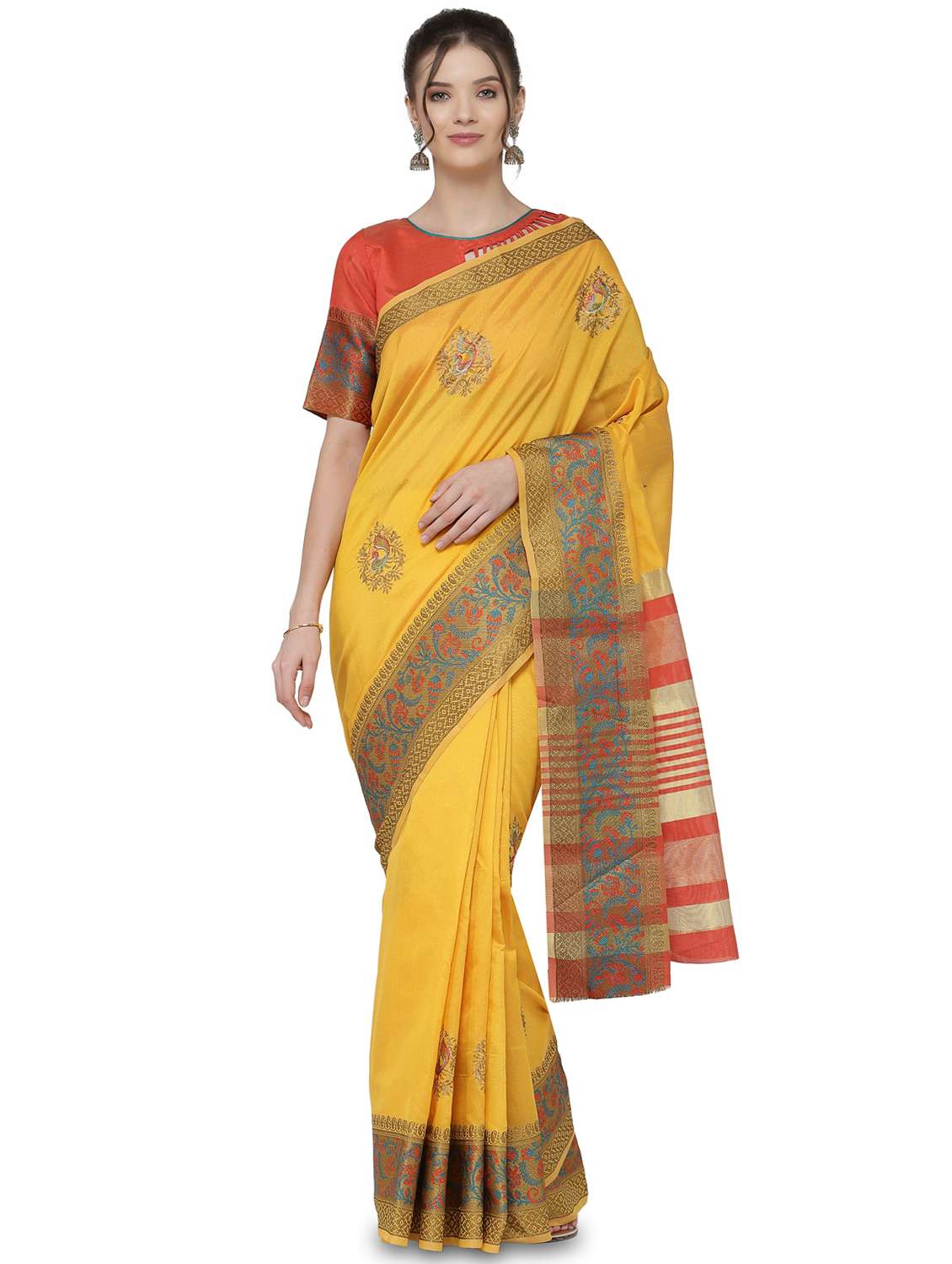 Saree fabric : Assam cotton silk. Blouse fabric :Assam cotton Silk.Work : colourful peacock embroidery work with Broad Border and Contrast pallu Length : 5.5 Mtr Blouse Length : 0.8 Mtr UnStitched Blouse Type : Party/Festive/Wedding Wear Saree