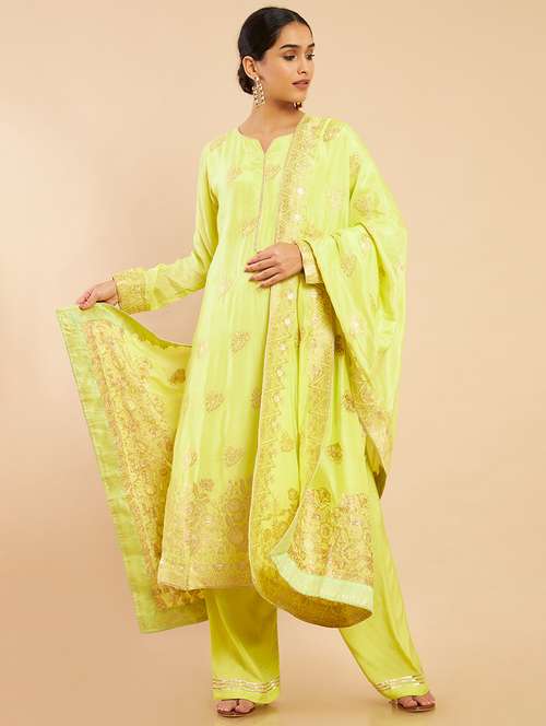 yellow coloured embroidered salwar unstitched suit
