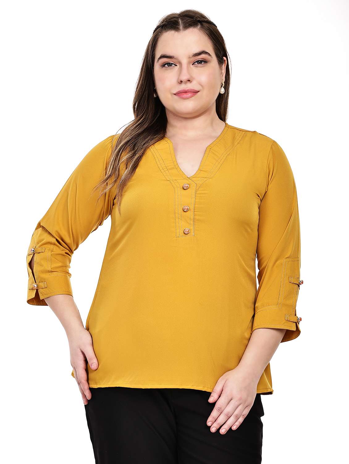 It Features a Yellow, three-quarter sleeve top with button and comfort is also an important factor ensuring ease of movement for dancing and socializing.
