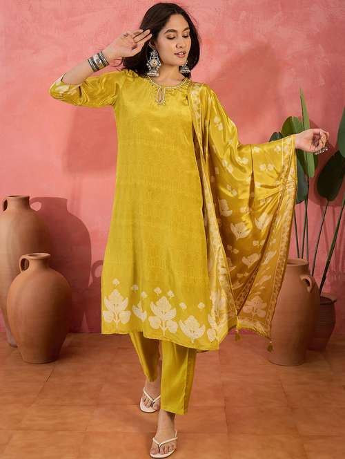 - Find gorgeous sets of ethnic wears in trending designs in yellow colors suitable for festive wear of occasions.