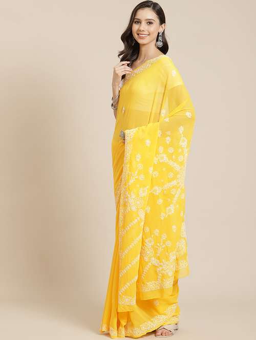 Silhouette: Feel elegant with Ada Chikankari saree. This alluring yellow faux georgette saree weaved with white cotton thread. The fabric is lightweight and soft, best for any season use.