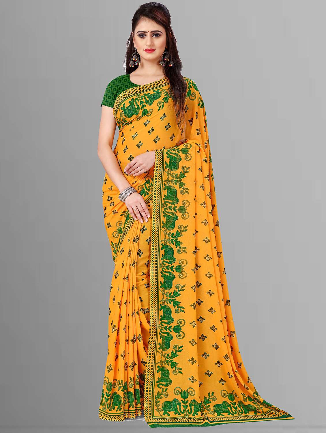 women yellow printed georgette saree with blouse