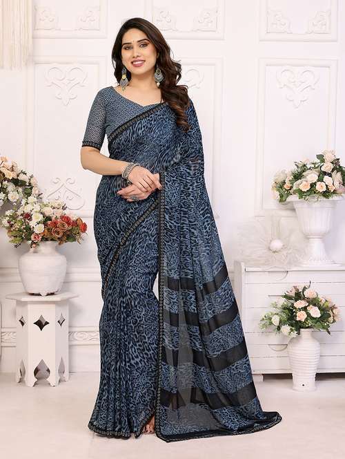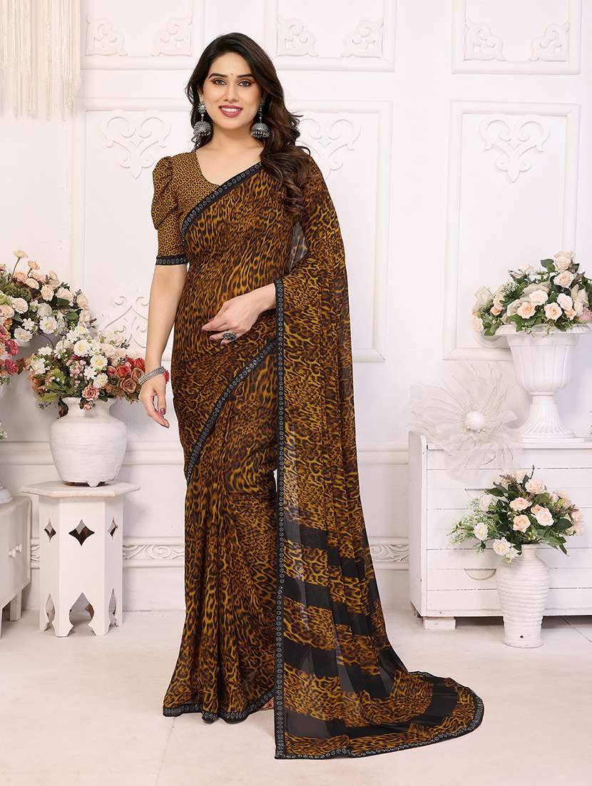 The Embellished Animal Print Georgette Saree with Diamond Lace Border in Yellow and Black is a bold and stylish choice for those looking to make a statement. Crafted from lightweight and breathable georgette fabric, this saree offers a comfortable drape and an effortlessly elegant look. The vibrant yellow base is enhanced with striking black animal prints, creating an eye-catching design that adds a contemporary edge. The intricate diamond lace border adds a touch of sophistication, making it perfect for festive occasions, parties, or semi-formal events. Pair it with a matching or contrasting blouse and subtle accessories for a chic, modern appearance.