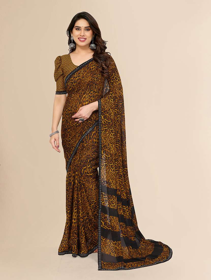 The Embellished Animal Print Georgette Saree with Diamond Lace Border in Yellow and Black is a bold and stylish choice for those looking to make a statement. Crafted from lightweight and breathable georgette fabric, this saree offers a comfortable drape and an effortlessly elegant look. The vibrant yellow base is enhanced with striking black animal prints, creating an eye-catching design that adds a contemporary edge. The intricate diamond lace border adds a touch of sophistication, making it perfect for festive occasions, parties, or semi-formal events. Pair it with a matching or contrasting blouse and subtle accessories for a chic, modern appearance.