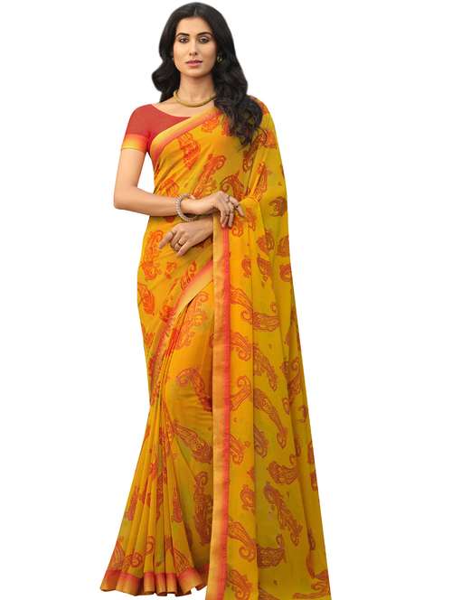yellow georgette printed saree with blouse - 19086464 - Very Small Image - 1