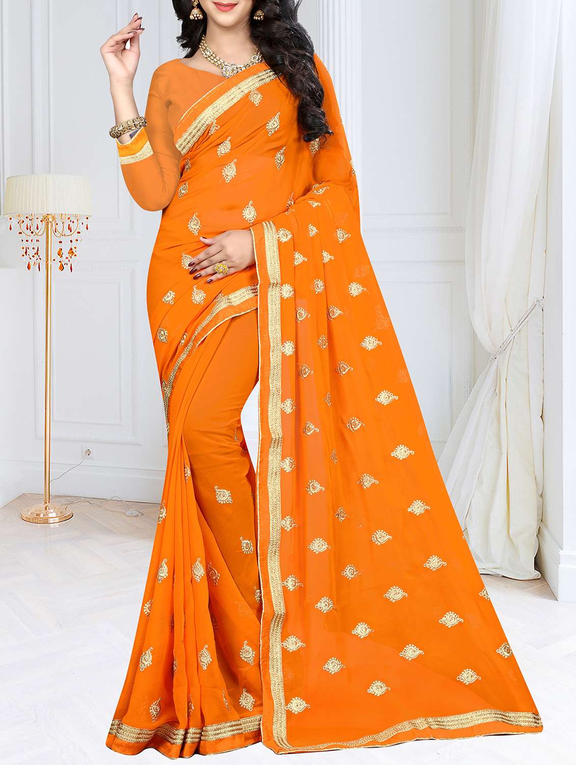 lace border orange embroidered saree