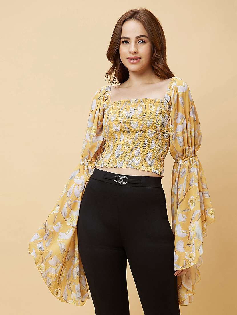 Elevate your party look with the Globus Women's Yellow Floral Smocked Long Flared Sleeve Crop Top. This vibrant piece boasts a square neck, long flared sleeves, and exquisite smocking detail, ensuring a regular and flattering fit. The striking floral print in sunny yellow adds a touch of elegance, making it perfect for special occasions. Make a stylish entrance at your next event with this versatile top that combines charm and contemporary fashion. Discover the allure of the Yellow Floral Smocked Crop Top today.
