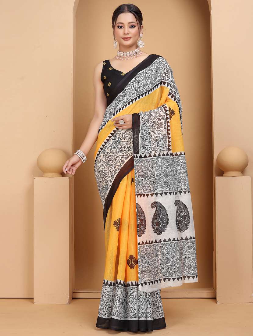 - » yellow linen printed saree