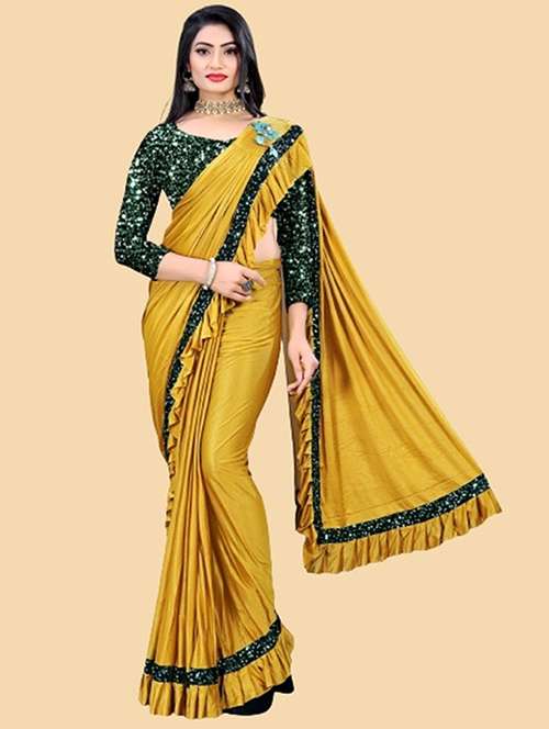 Ready to Wear Saree, Fabric: Lycra, Work : Squence Embroidered, Saree Length of 5.25 meters in Yellow Color, The saree comes with a blouse piece 0.75 meter Velvet Squence Embroidered Work. It is unstitched and can be altered according to your fit and style that you require