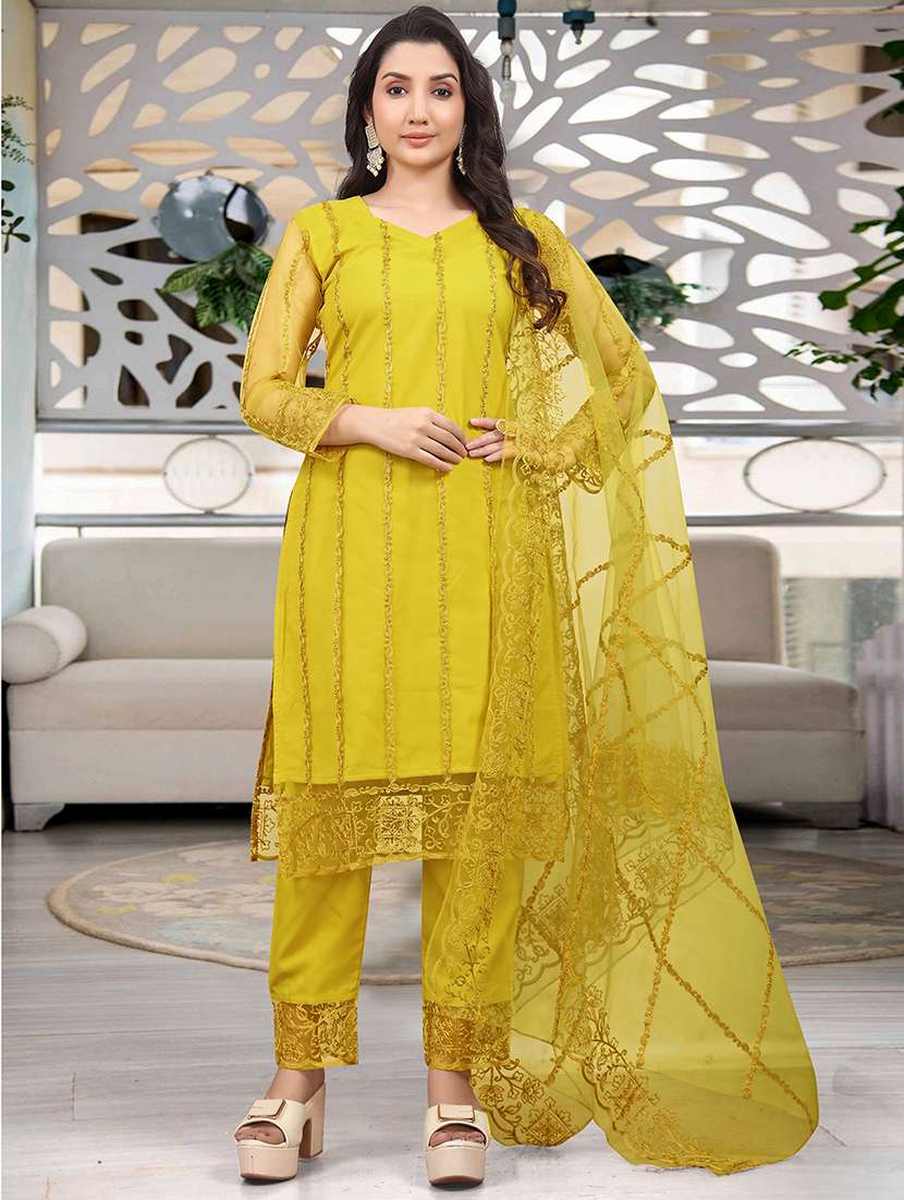 - Find gorgeous sets of ethnic wears in trending designs in yellow colors suitable for festive wear of occasions.