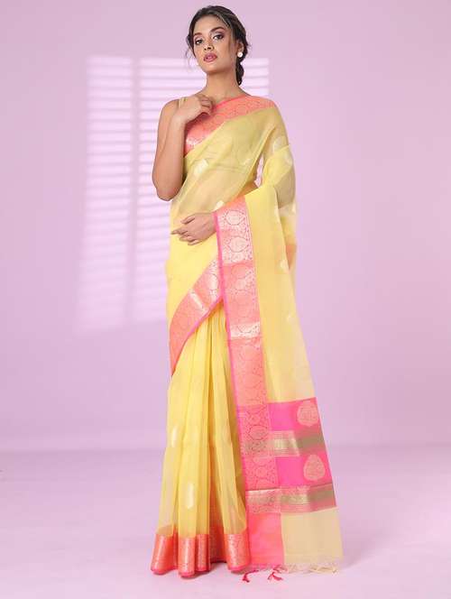 Drape a sheer piece of class and elegance with this yellow organza saree. It has zari-woven damask motifs all over. The contrasted pink borders and pallu have zari-woven damask and nakshi patterns for a charming look.