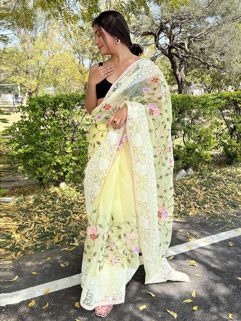 chikankari floral printed saree with blouse