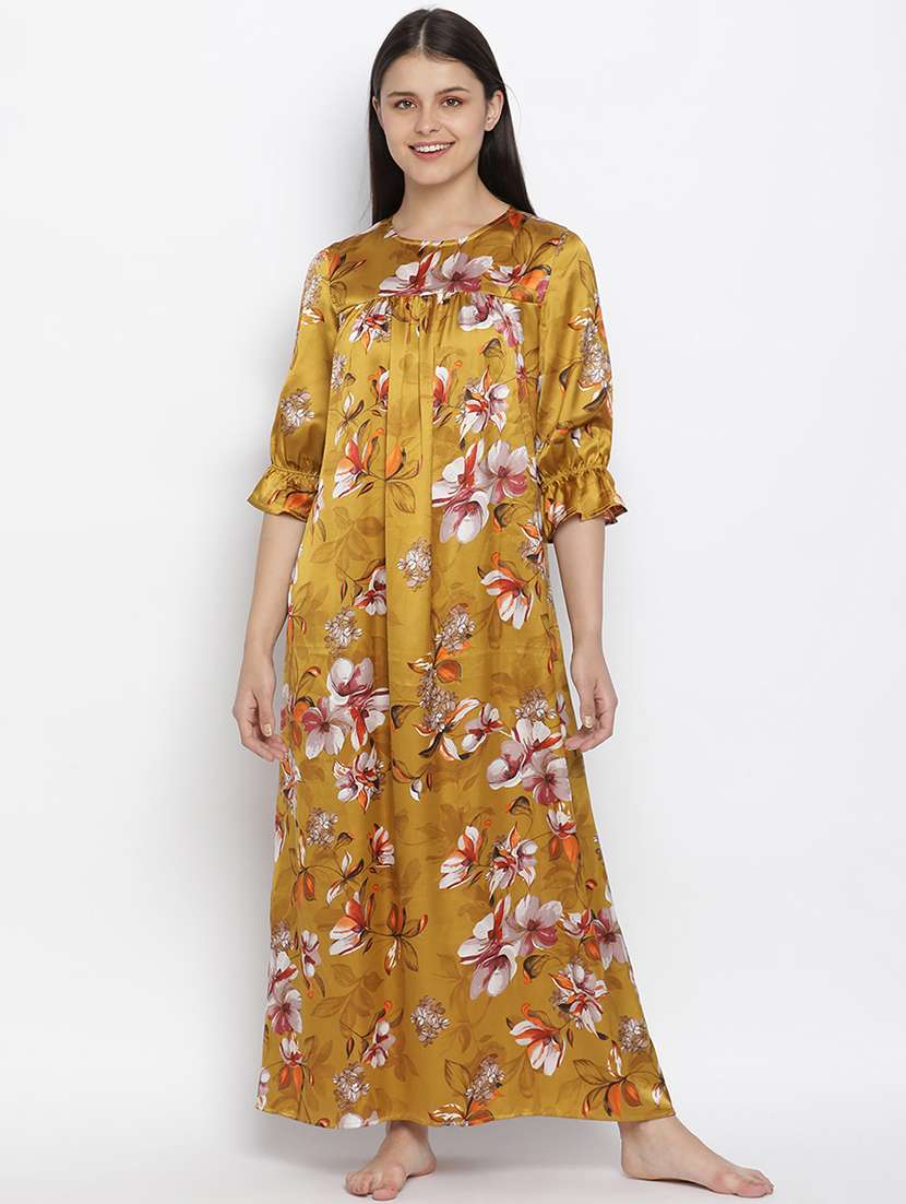 Hit the rest mode wearing comfy Mustard floral satin print women's nightwear dress. It is fashioned with an all-over floral print 3/4 flared sleeves, round neckline along with gathered pleats on the chest. Grab this and golden sleep hours in style.