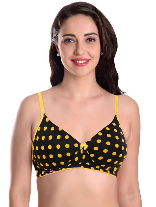 Featherline polka print t-shirt bra is everyday wear that gives both style and comfort. It is crafted with smooth and soft poly cotton fabric, which gives it a subtle finish and is non-wired, which limits pokes. The bra comes with full cups, which are excellent to avoid any awkward spillage situation. The contrasting-colour fabric at the underbust along with contrasting-colour straps and polka print give this bra a trendy and stylish look. The bra also has detachable straps, and therefore it can be styled in whatever way you want.
