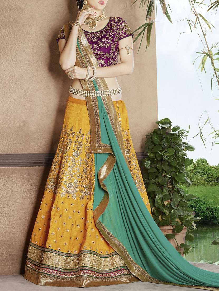 - » yellow raw silk flared lehenga