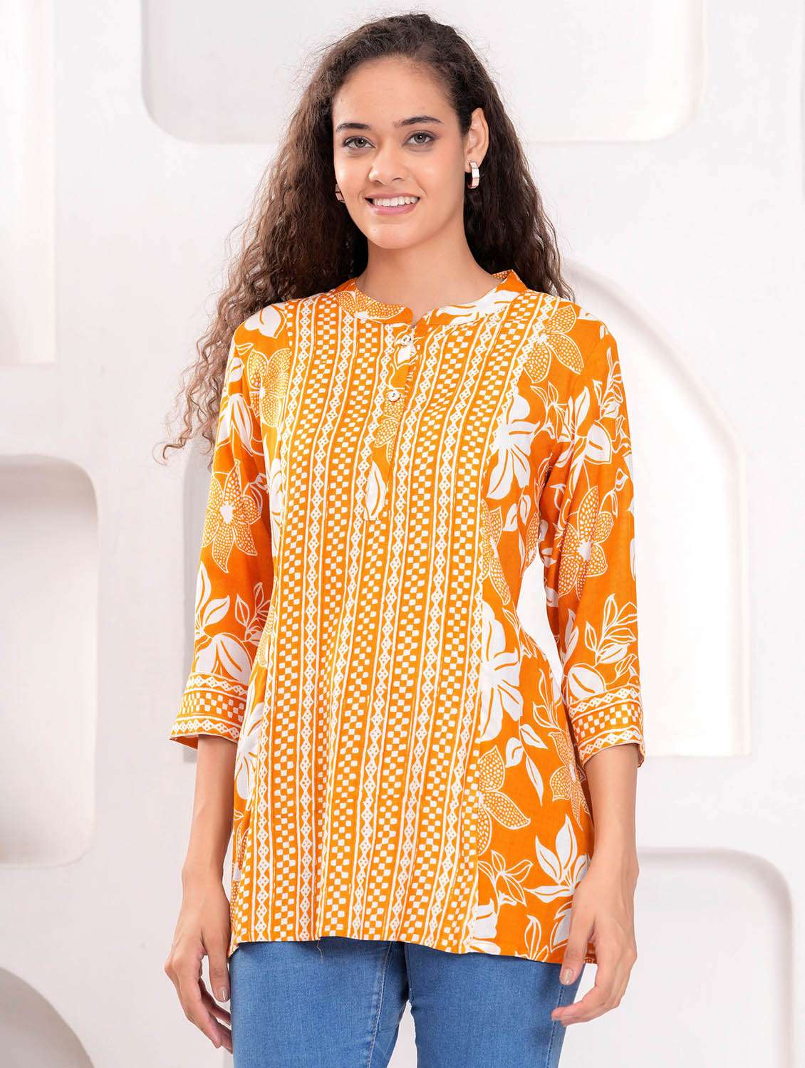 - » women printed three quarter sleeve a-line kurti
