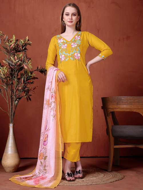 - Find gorgeous sets of ethnic wears in trending designs in mustard colors suitable for festive wear of occasions.