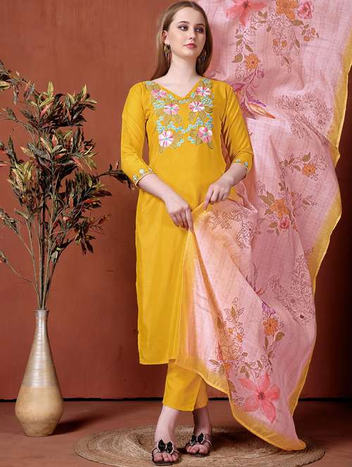 - Find gorgeous sets of ethnic wears in trending designs in yellow colors suitable for festive wear of occasions.