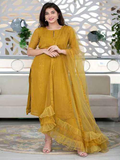 - Find versatile complete set of semi-stitched suits in trending designs in yellow colors suitable for casual wear occasions.