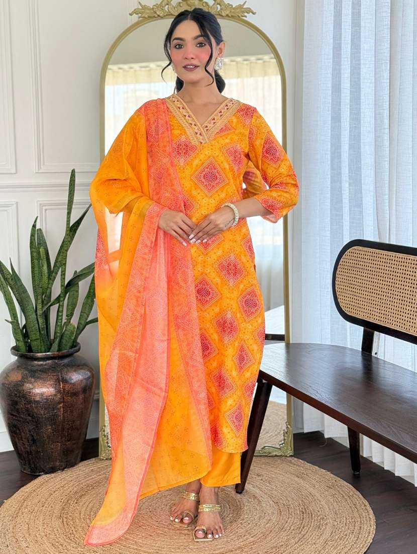 women bandhani three quarter sleeve kurta pant with dupatta set