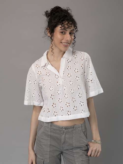 - Opt for this top made up of schiffli material and get it in a varied neck design.