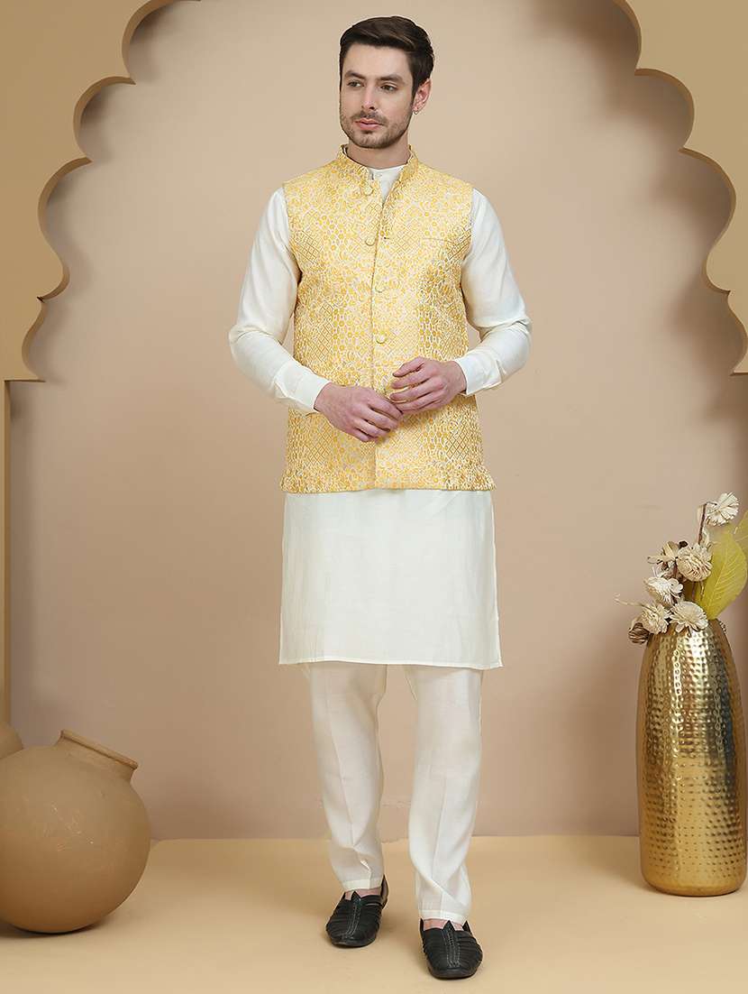 This cream kurta set, accentuated by a stunning Yellow woven Nehru jacket. With its intricate detailing and classic mandarin collar, this ensemble brings a graceful, polished look perfect for weddings, festive gatherings, or cultural celebrations.
