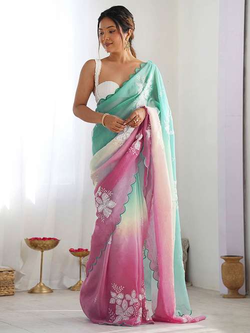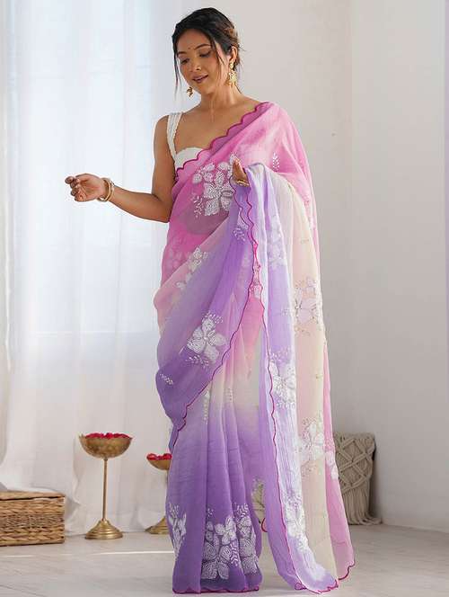 This captivating orange and yellow ombre silk blend saree showcases exquisite floral sequin embroidery and a graceful scalloped border, creating a look of timeless elegance. Made from premium gold crush silk blend, it offers a luxurious feel with lightweight comfort for effortless draping. The saree comes with a solid Banglory silk unstitched blouse piece, allowing you to customize the fit and style as desired. Perfect for festive occasions, parties, or refined office wear, this saree adds sophistication to any setting.