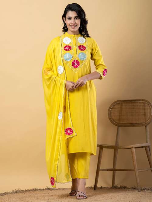 - Find gorgeous sets of ethnic wears in trending designs in yellow colors suitable for festive wear of occasions.